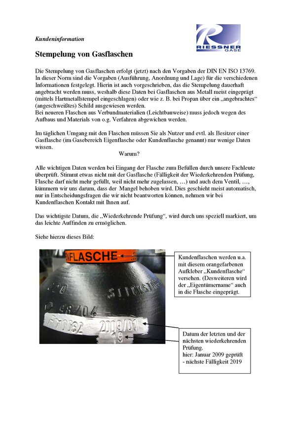 In dieser Norm sind die Vorgaben (Ausführung, Anordnung und Lage) für die verschiedenen Informationen festgelegt. Hierin ist auch vorgeschrieben, das die Stempelung dauerhaft angebracht werden muss, weshalb diese Daten bei Gasflaschen aus Metall meist eingeprägt (mittels Hartmetallstempel eingeschlagen) oder wie z. B. bei Propan über ein „angebrachtes“ (angeschweißtes) Schild ausgewiesen werden.