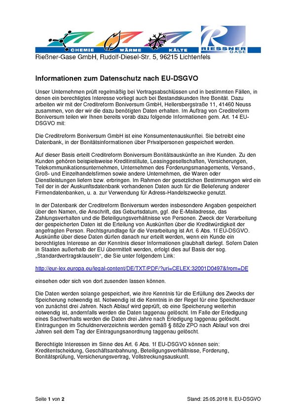 Unser Unternehmen prüft regelmäßig bei Vertragsabschlüssen und in bestimmten Fällen, in denen ein berechtigtes Interesse vorliegt auch bei Bestandskunden Ihre Bonität. Dazu arbeiten wir mit der Creditreform Boniversum GmbH, Hellersbergstraße 11, 41460 Neuss zusammen, von der wir die dazu benötigten Daten erhalten. Im Auftrag von Creditreform Boniversum teilen wir Ihnen bereits vorab dazu folgende Informationen gem. Art. 14 EU- DSGVO mit: